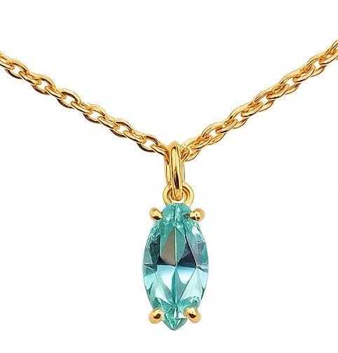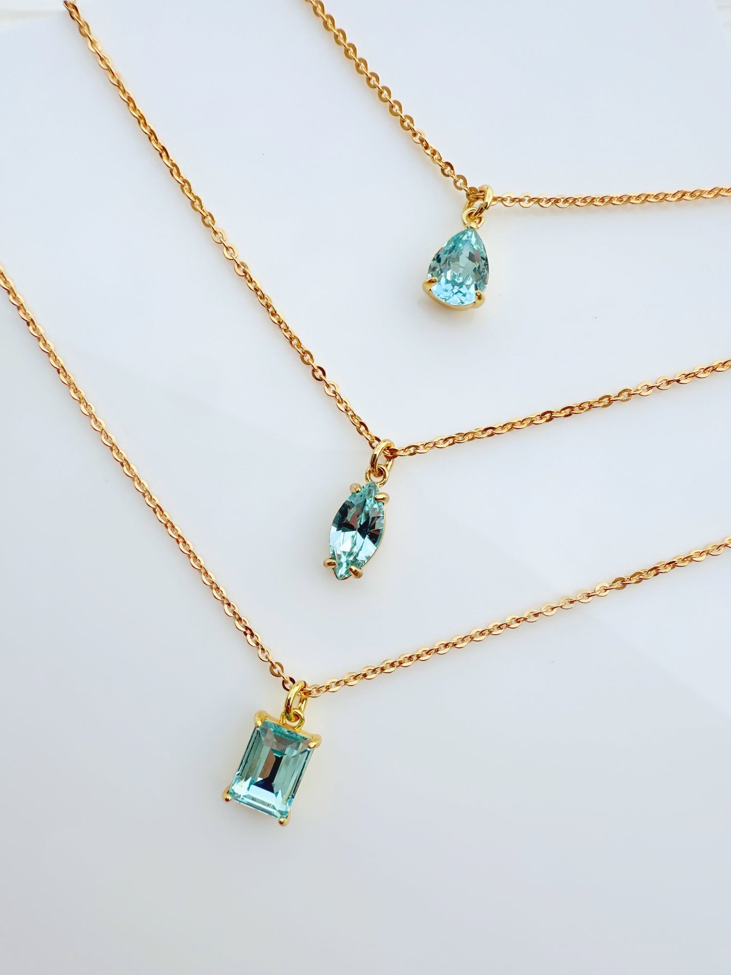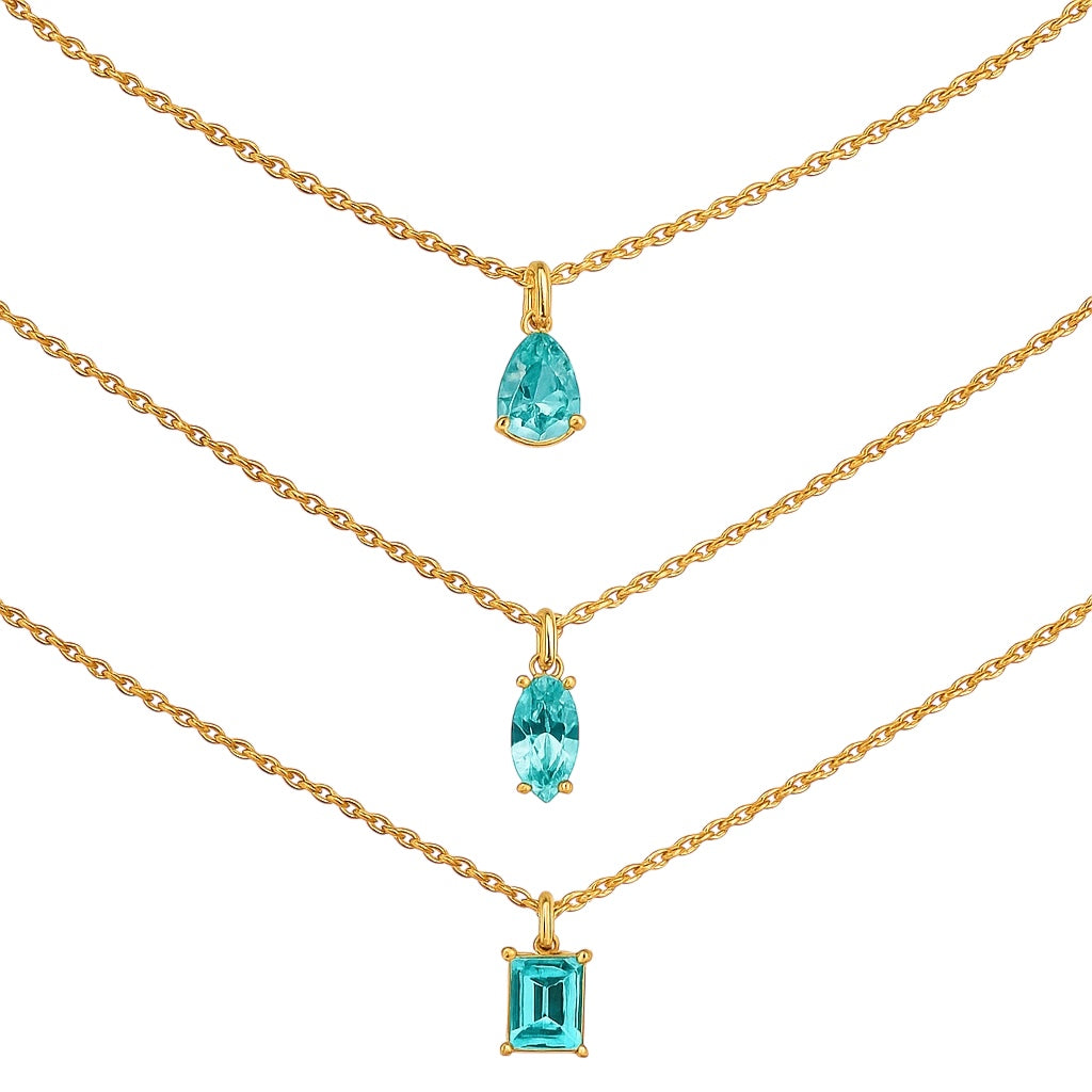 These dainty 18K gold-filled necklaces feature a brilliant aqua stone pendant in your choice of shape — pear, marquise, or emerald cut. Each one adds a luminous touch of color that brightens the neckline with a fresh, elegant glow. The 16” chain with a 2” extender lets you layer or wear solo with ease. Sold separately — pick the shape that speaks to you!