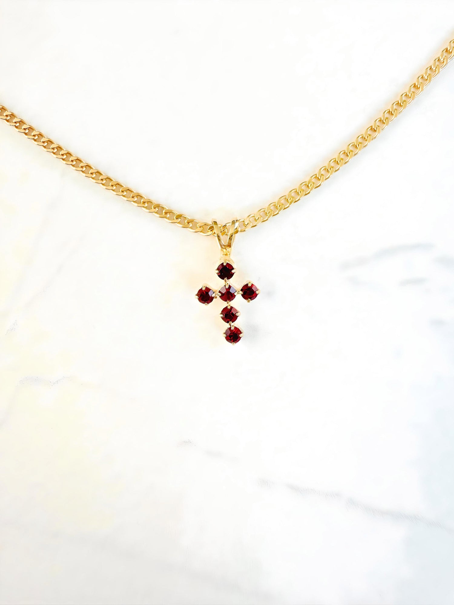 Crafted in 18K Gold Filled, this cross necklace features premium AAA zirconia stones in clear, black, or red. Water and fade-resistant, it comes with a 2mm Cuban chain in 16” or 18”, making it a versatile piece for everyday style.