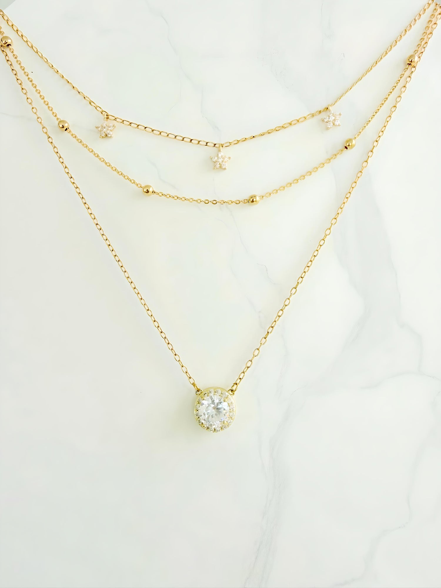 Delicate yet eye-catching, this gold charm necklace combines sparkling clear zircons with different chain textures, creating a fresh, feminine, and timeless style. It’s the kind of pendant necklace that makes any outfit glow, whether for everyday wear or special occasions.