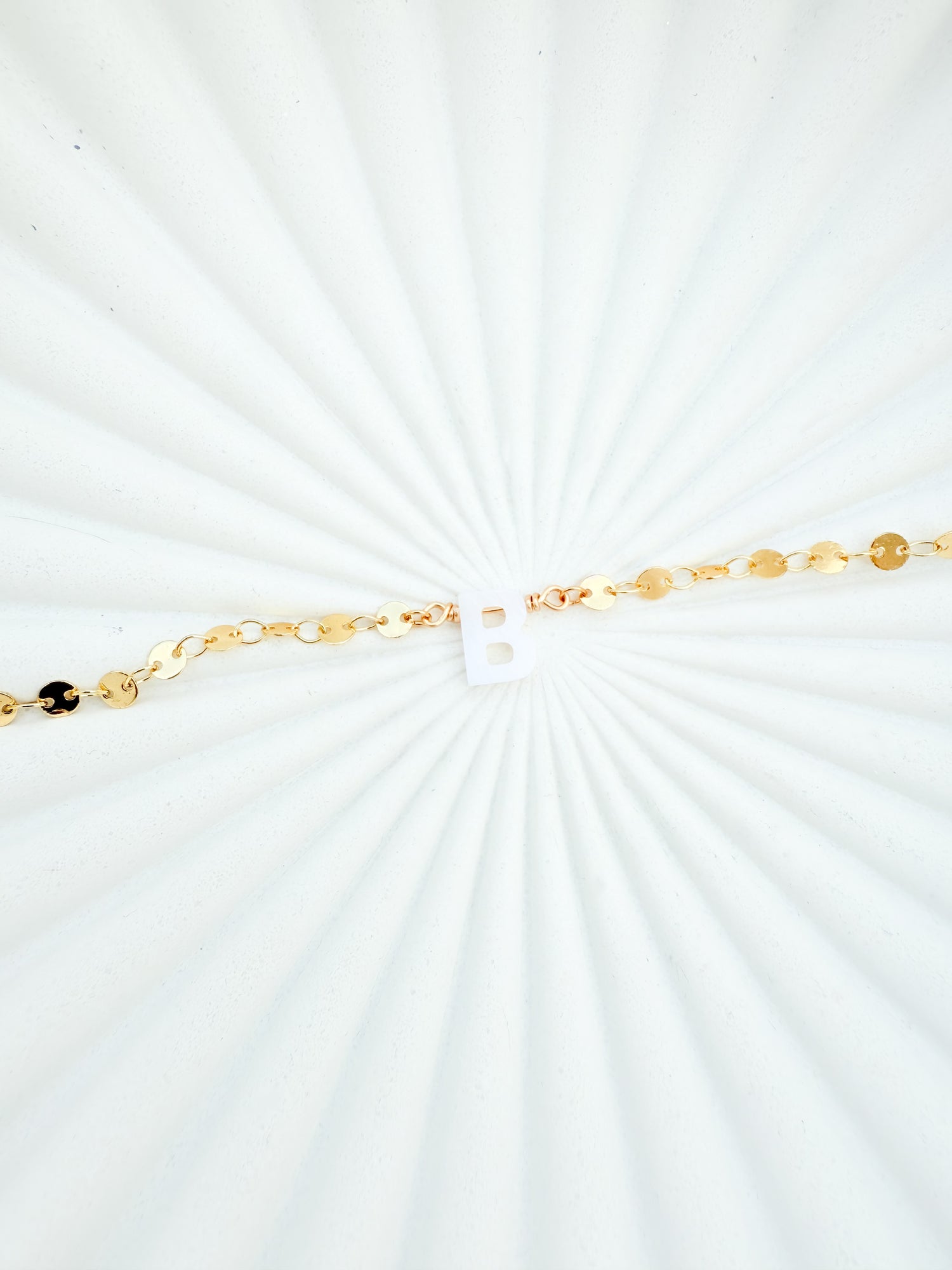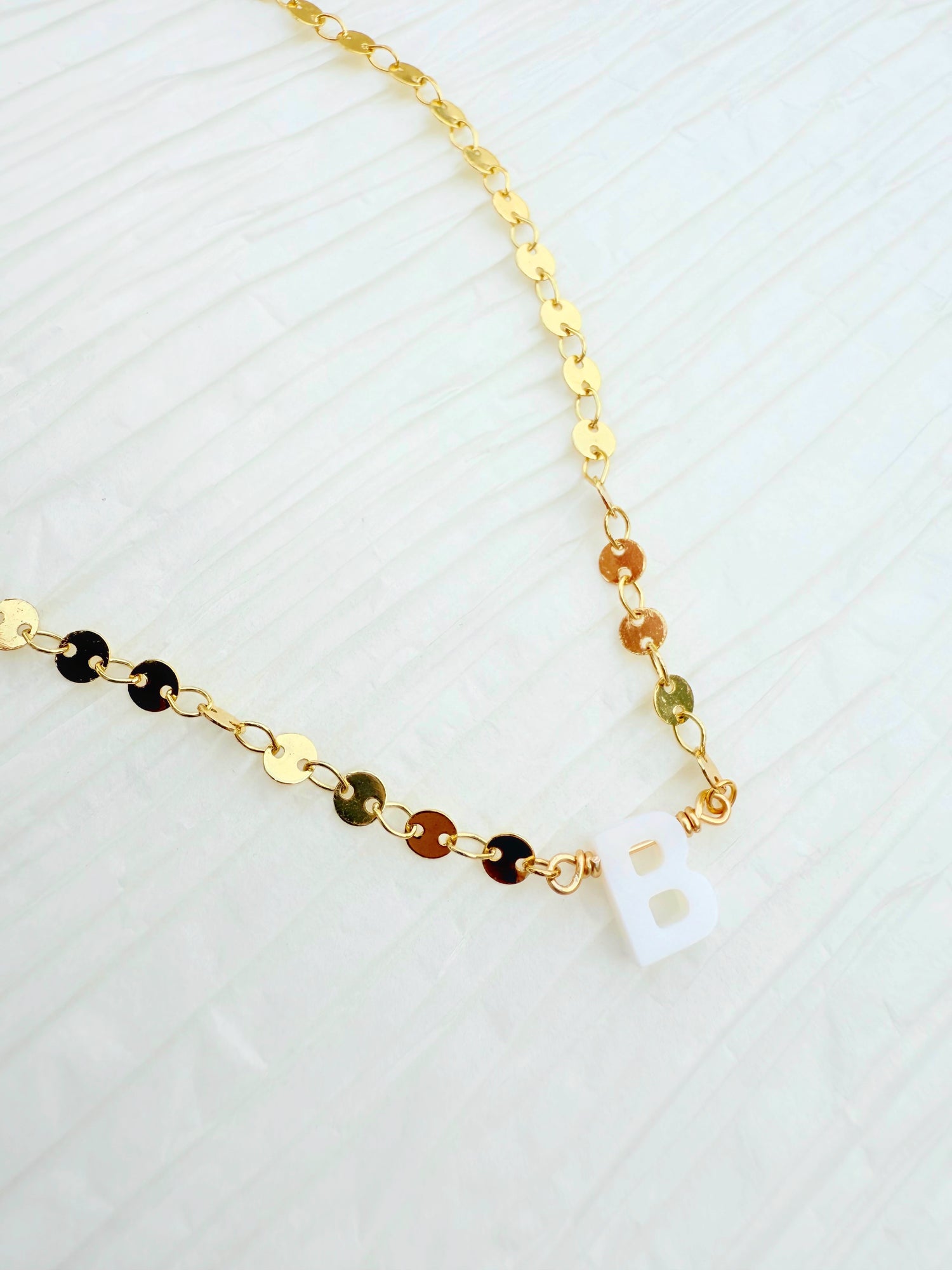 This stunning necklace is pure glow. The gold filled sequin chain shines beautifully with every movement, and the mother of pearl initial charm adds the perfect personal touch.