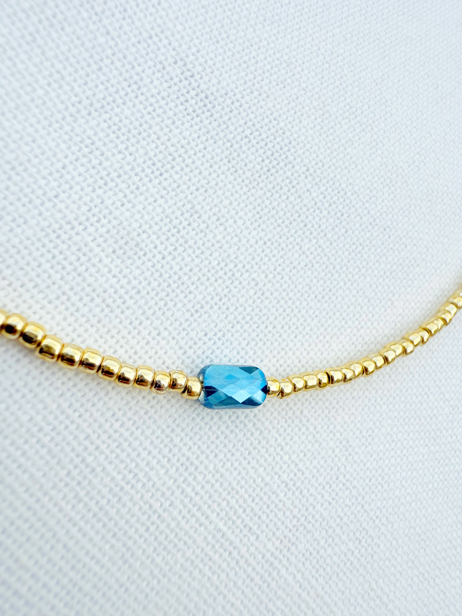 - Materials: Premium Japanese Miyuki beads (gold tone) & faceted blue glass centerpiece