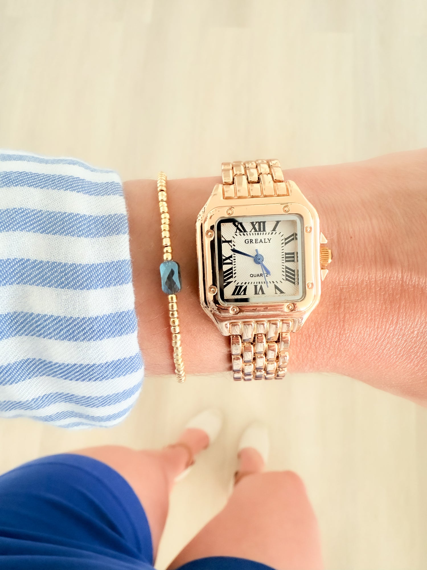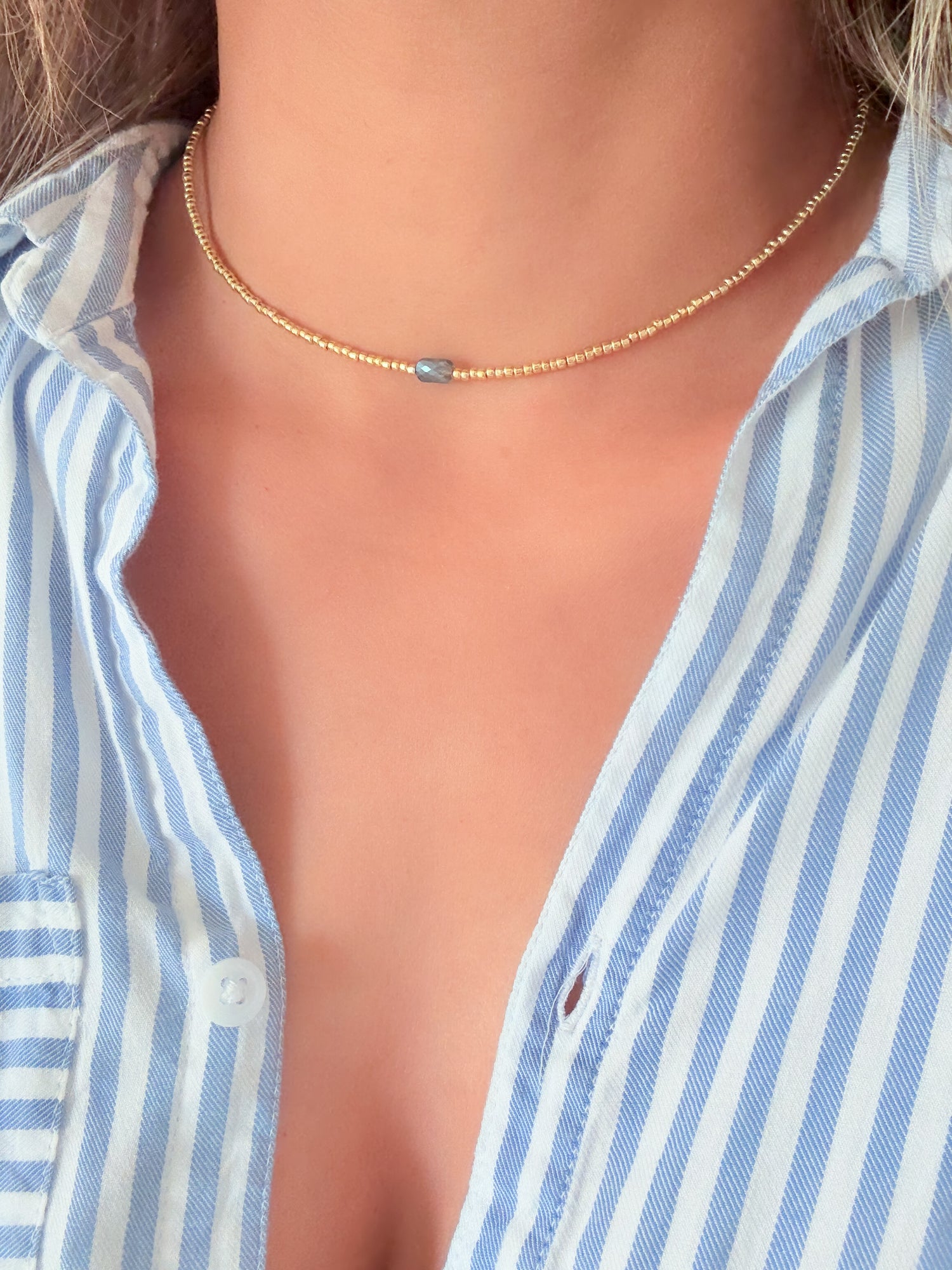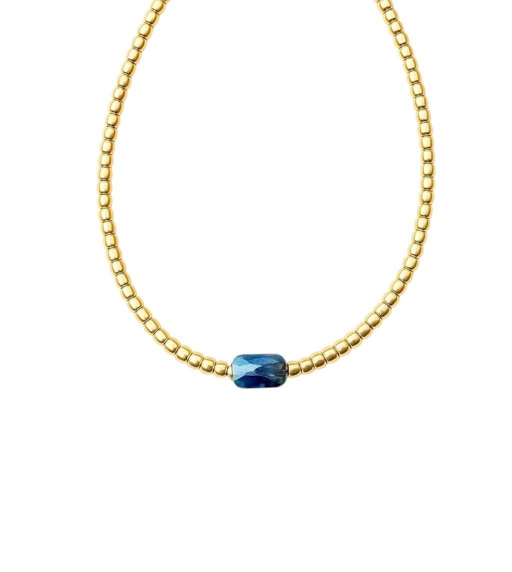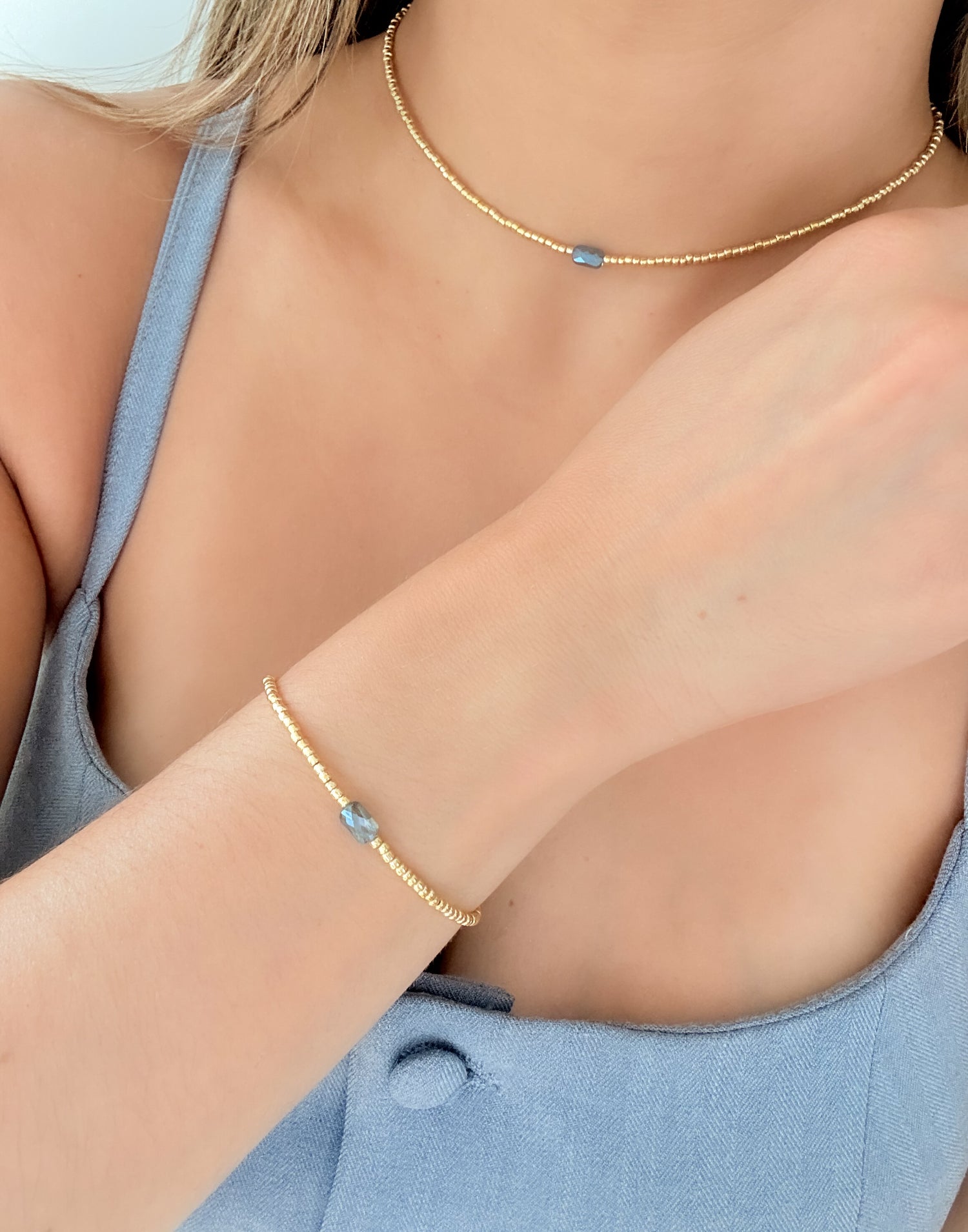 The necklace and bracelet offer a modern yet timeless look, perfect for layering or wearing alone as a subtle statement. The central blue bead evokes a drop of the sea, adding charm and personality to the refined gold palette.