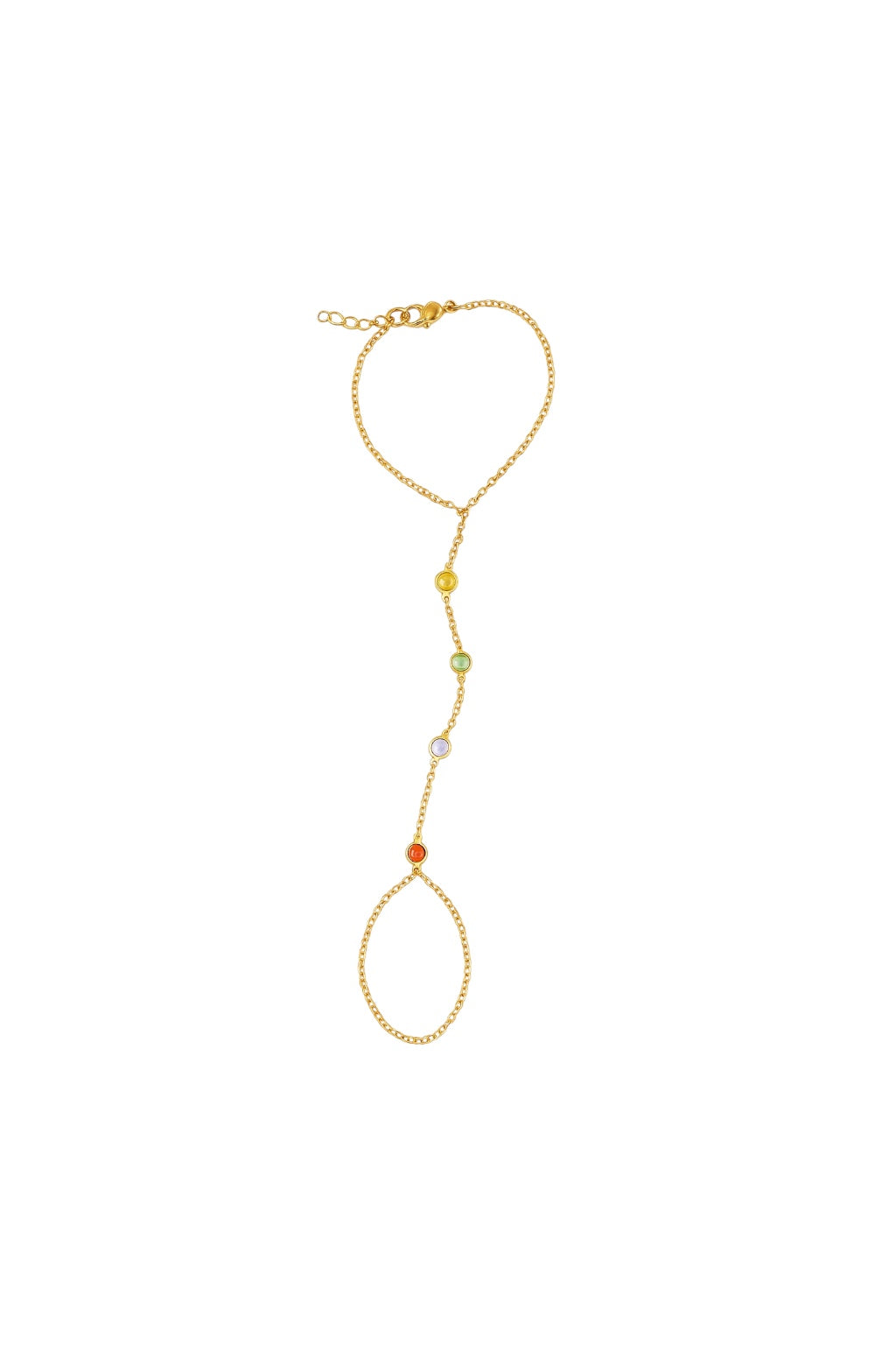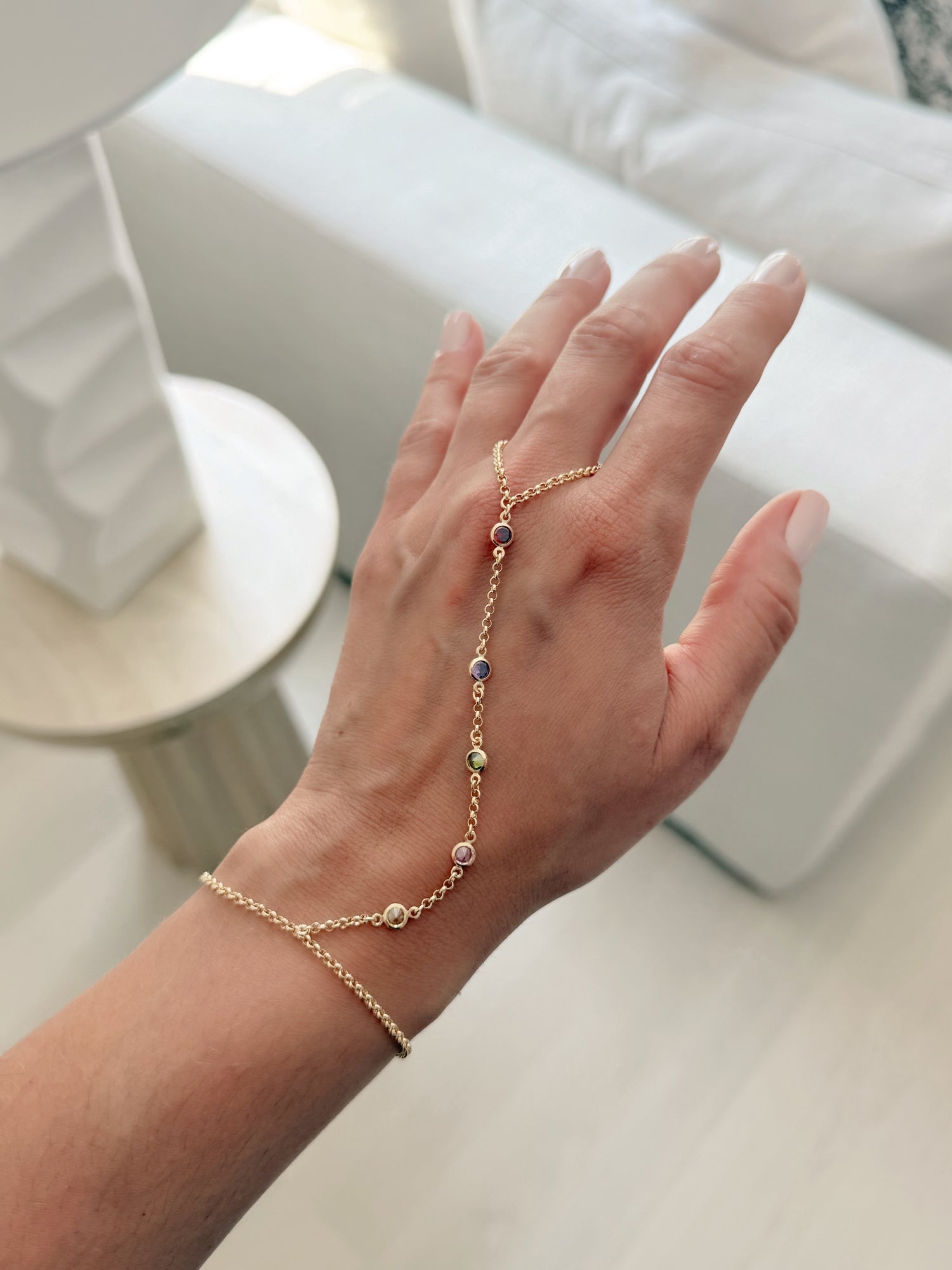 This playful hand chain is full of joyful energy — featuring a delicate gold chain and a rainbow of tiny zircon stones that sparkle with every move. It’s that sweet touch of color your everyday look has been waiting for.