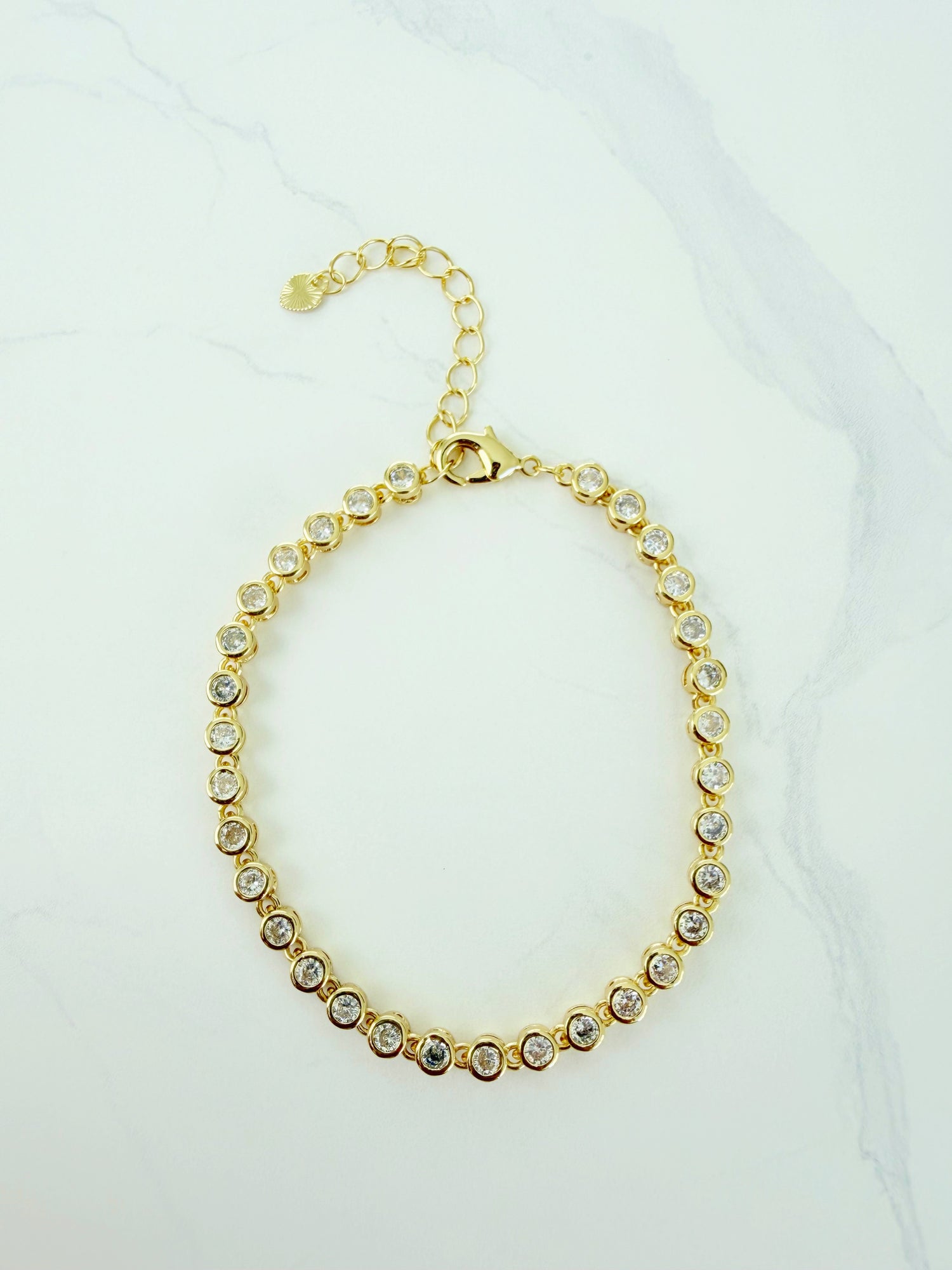 Indulge in sophistication with our Round CZ Bezel Tennis Bracelet! Perfect for any occasion, this sparkling piece adds a touch of charm and elegance to any outfit. The timeless design and exquisite zircons guarantee to capture the light and turn heads. Elevate your look with effortless chic!