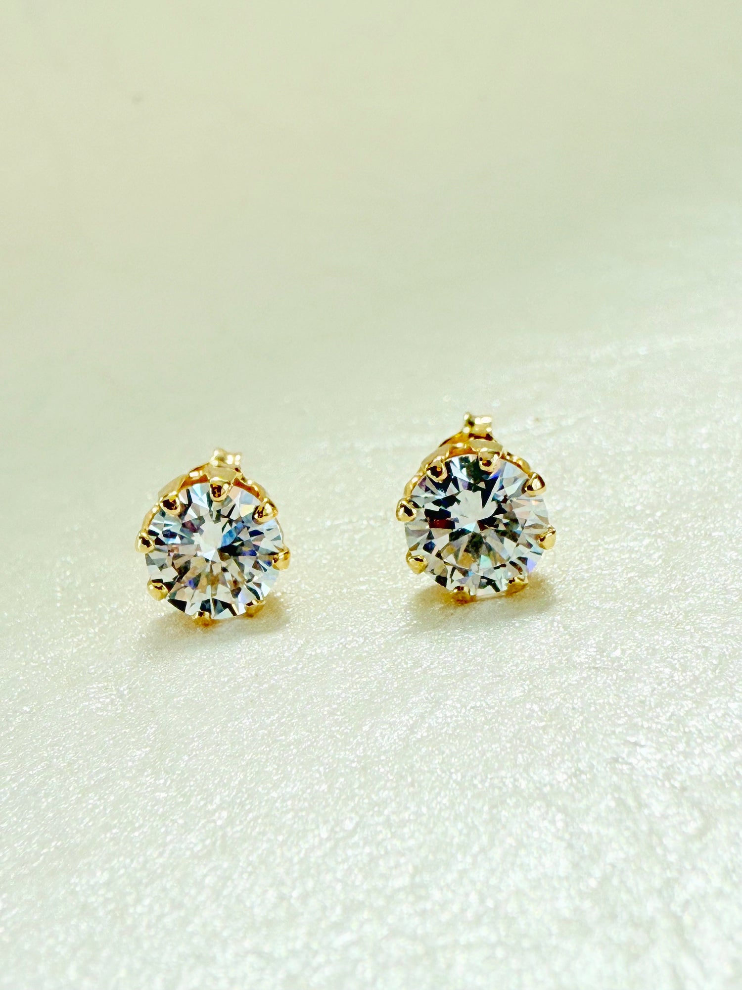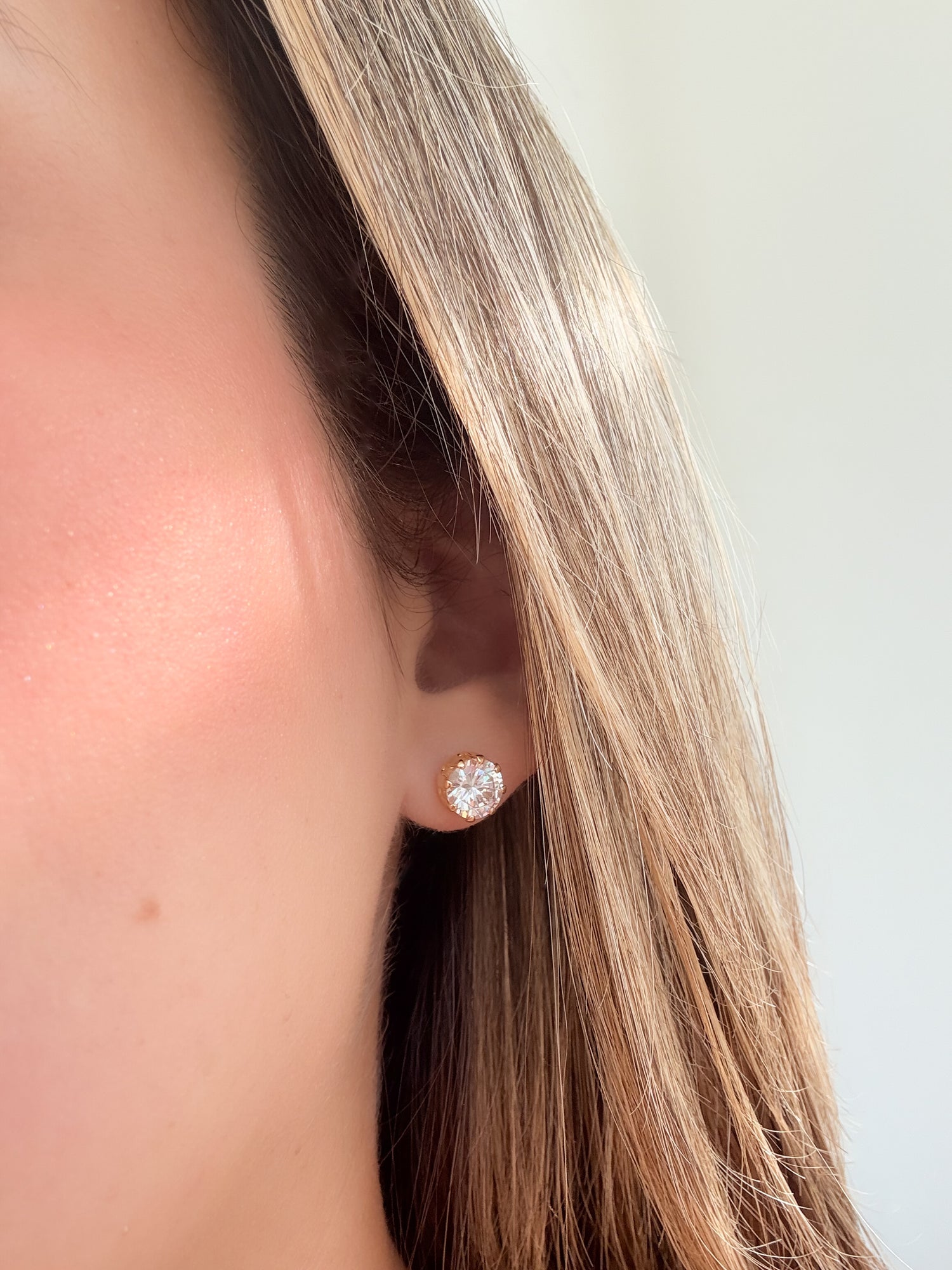 These 18K Gold Filled earrings feature a 7mm round Cubic Zirconia that shines like a VVS diamond — clean, bright, and full of light.