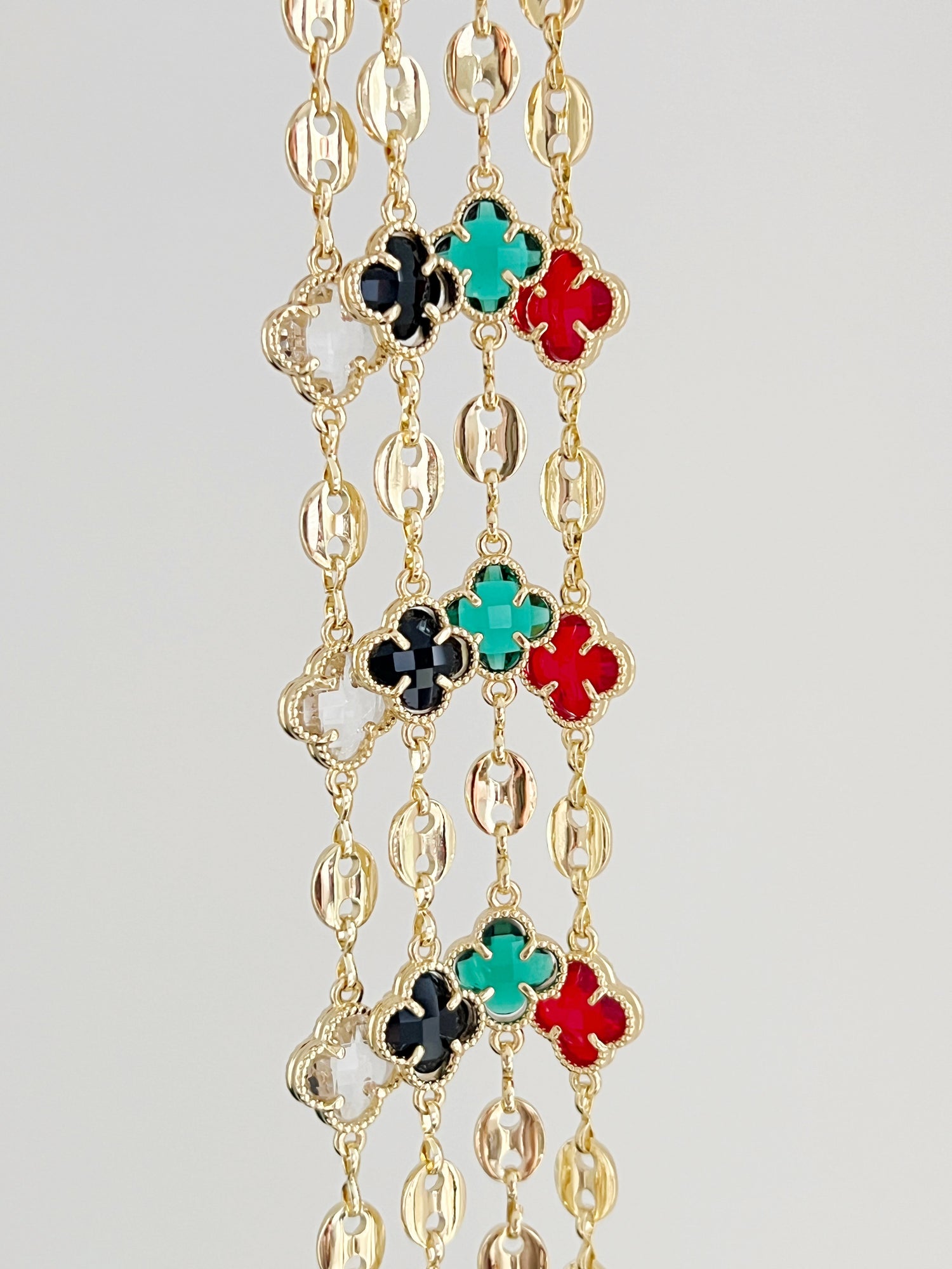 This unique bracelet features an exclusive design that combines the elegance of puff mariner links with the refined touch of delicate clovers adorned with crystals. The crystals are available in a variety of vibrant colors: red, green, transparent, and black, offering the perfect choice for different styles and occasions.