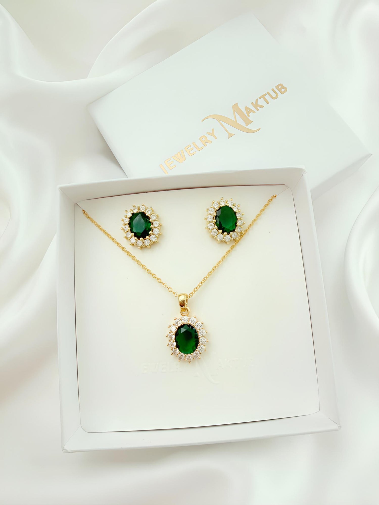 This jewelry set brings a soft, radiant glow to any look. The oval pendant and matching stud earrings shimmer with light, available in two captivating shades — deep Emerald Green or vibrant Ruby Red. A classic style that feels special every day.