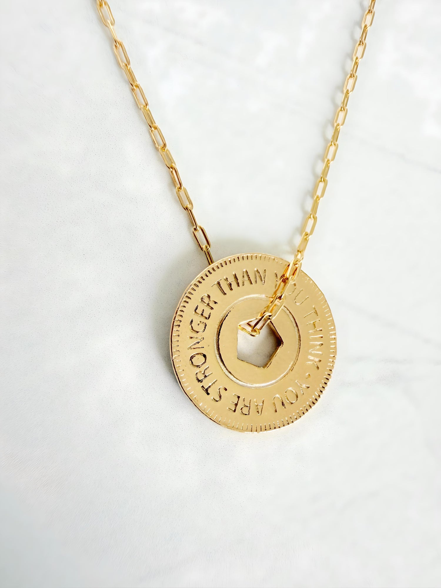 This inspirational necklace features a timeless coin pendant crafted in 18K Gold Filled, designed to uplift and elevate your everyday style. Paired with a modern paperclip chain in 16” or 18”, it’s a meaningful piece that reminds you — or someone you love — of inner strength and positivity, while offering lasting shine and durability.